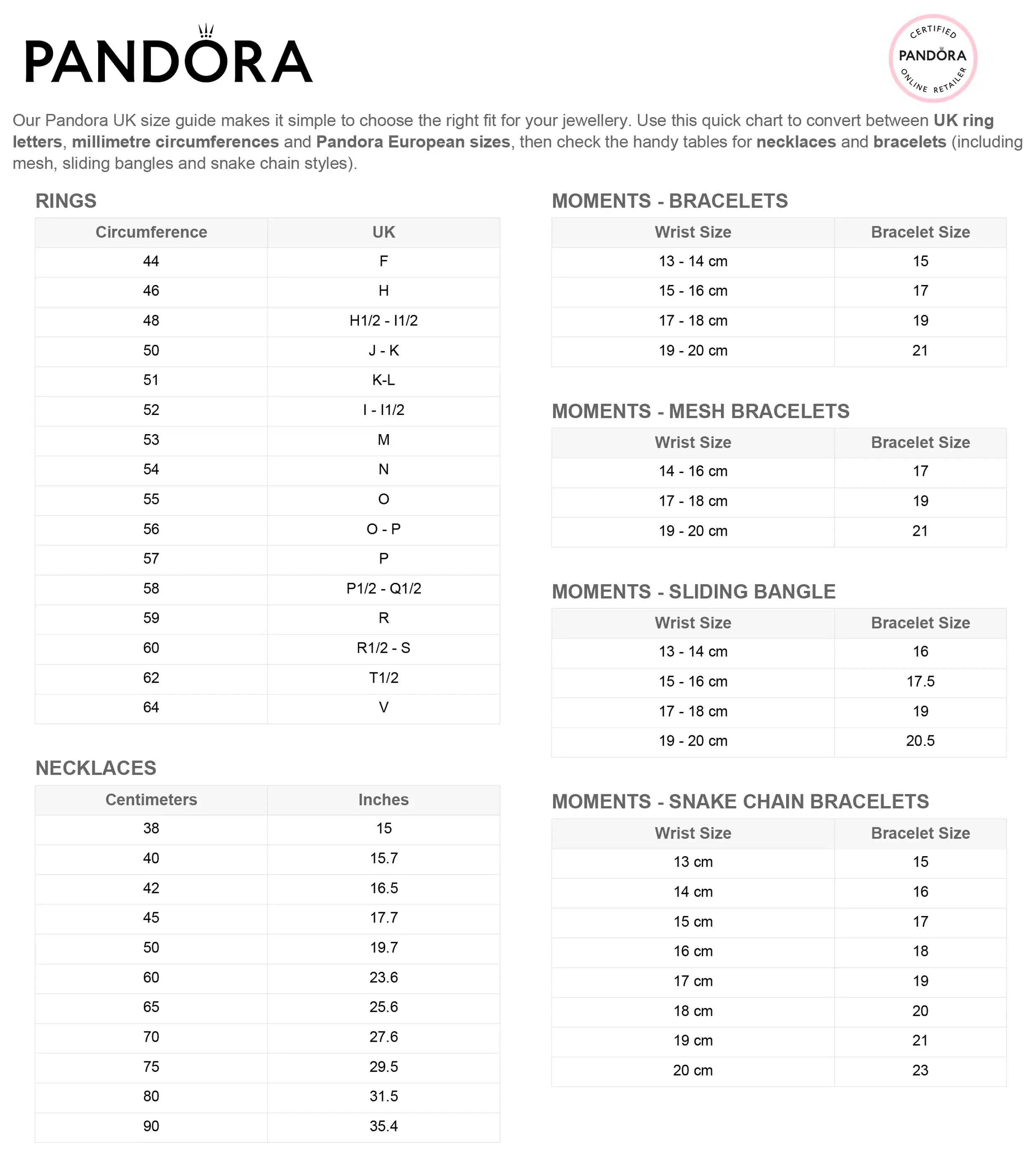 Sizing for the Pandora jewellery can often be a minefield so we have added our size guide here to make things easier for you when chosing your rings, bracelets and necklaces.